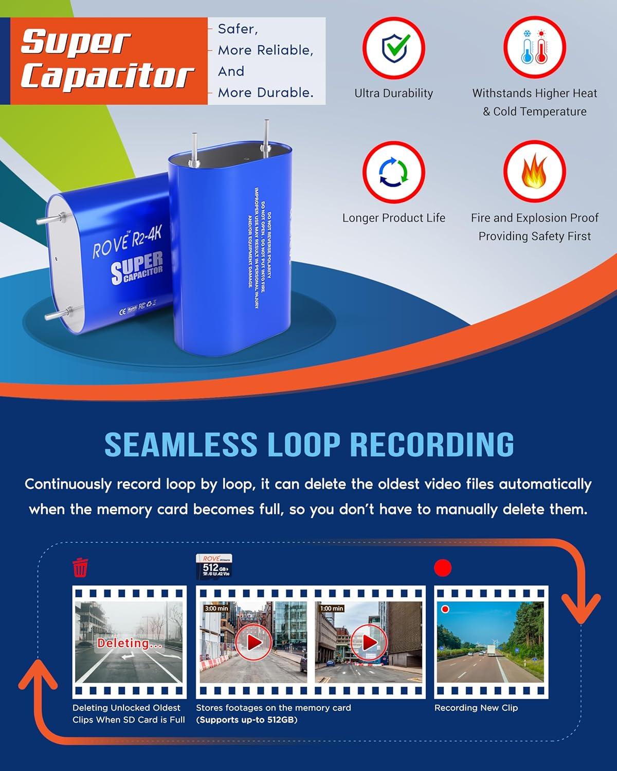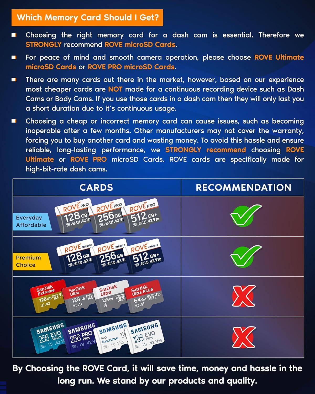 FEATURES WITH STATE-OF-THE-ART TECHNOLOGY INCLUDED – The car dashboard camera comes with a built-in Supercapacitor, f1.5 apertures (the largest in the industry), parking mode, motion detection, 150° A+ wide angle lens, G-sensor, loop cycle recording, emergency video lock, time-lapse video, supports up to 512GB class 10 – U3 speed micro SD card (NOTE: MEMORY CARD NOT INCLUDED – We recommend ROVE Ultimate Micro SD Cards)