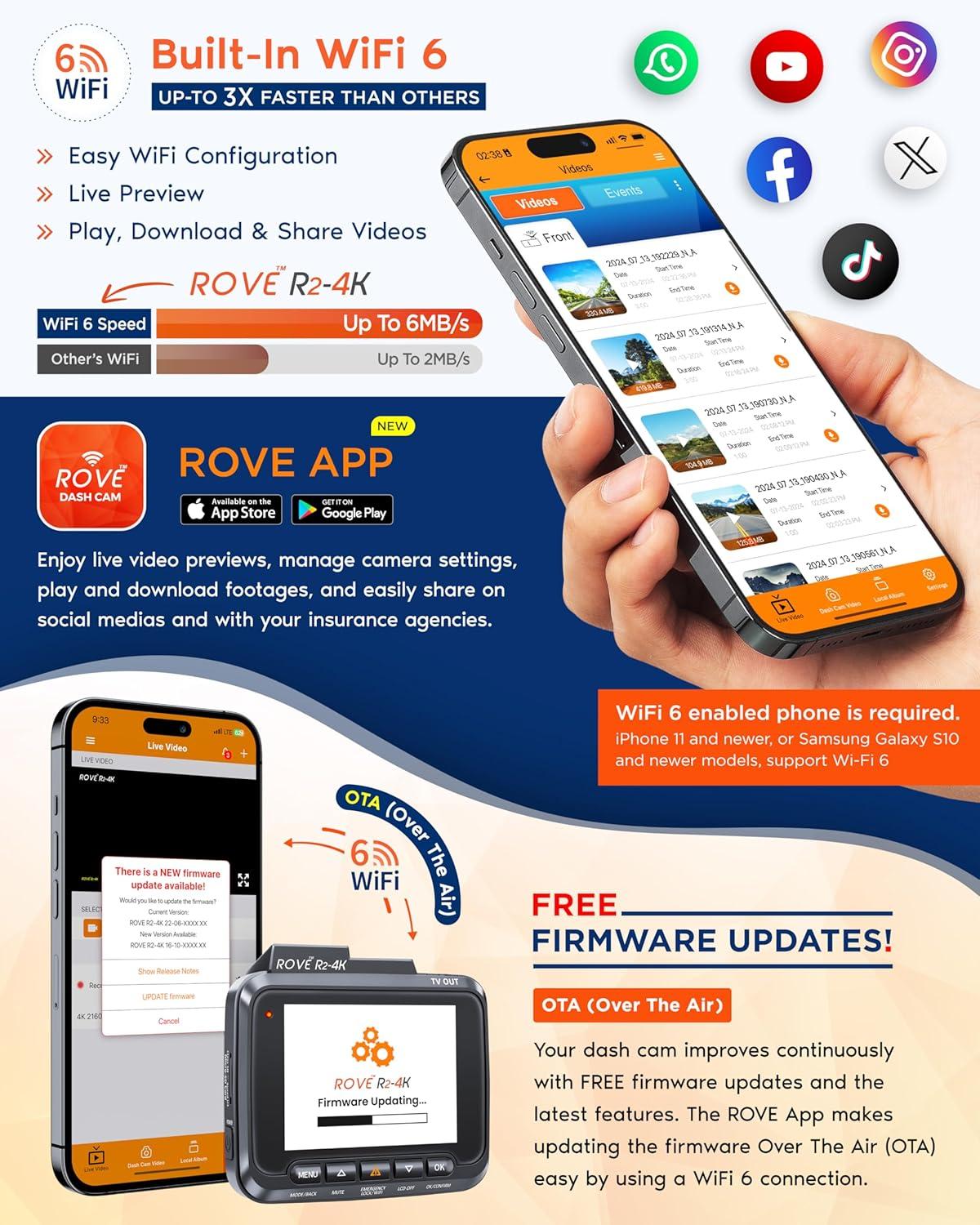 BUILT-IN WiFi 6 — Use the ROVE App to view and manage dash cam recordings instantly on your iPhone (iOS) or Android smartphone. Download your recorded 4K videos directly to your smartphone at a speed of up to 6MB/s, and easily share them on social media with friends and family.