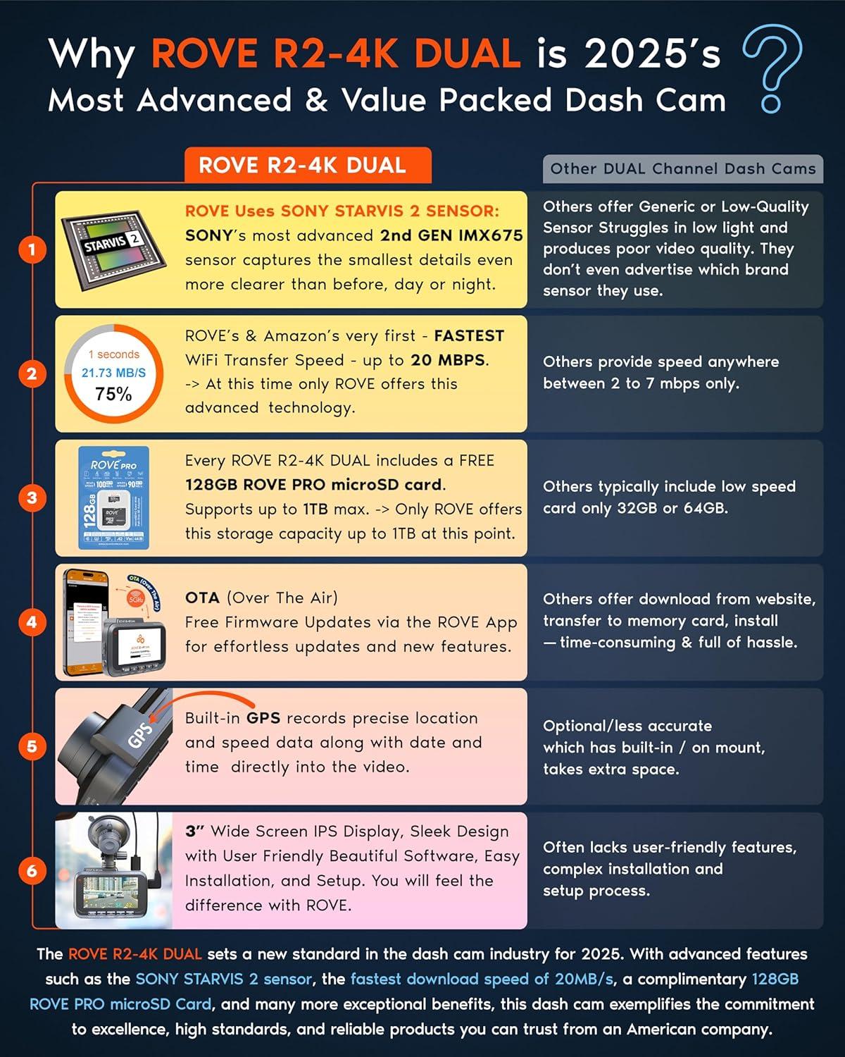 ROVE R2-4K DUAL DASH CAM: Experience 2025's most advanced and value-packed 4K dual dash cam, featuring a Sony STARVIS 2 image sensor that captures the smallest details even in low-light conditions. Enjoy blazing-fast 20MBps 5G WiFi download speeds and a free 128GB microSD card for ample storage right out of the box.