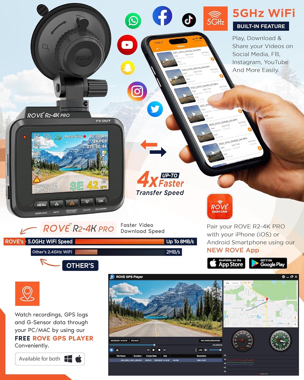 [ROVE R2-4K PRO DASH CAM] Today's highly advanced and powerful 4k dash cam that records videos at the resolution of 2160P (4k) @30fps, 1440P (2.5K) @60fps, 30fps & 1080P (HD) @60fps, 30fps. The car camera features built-in 5G Wi-Fi, GPS, and Supercapacitor