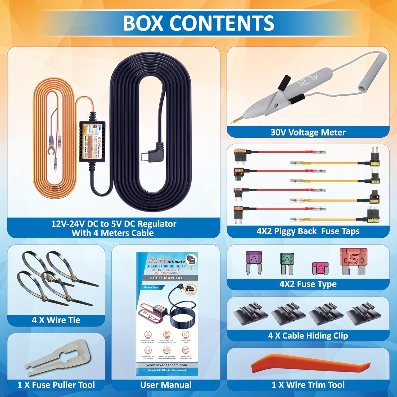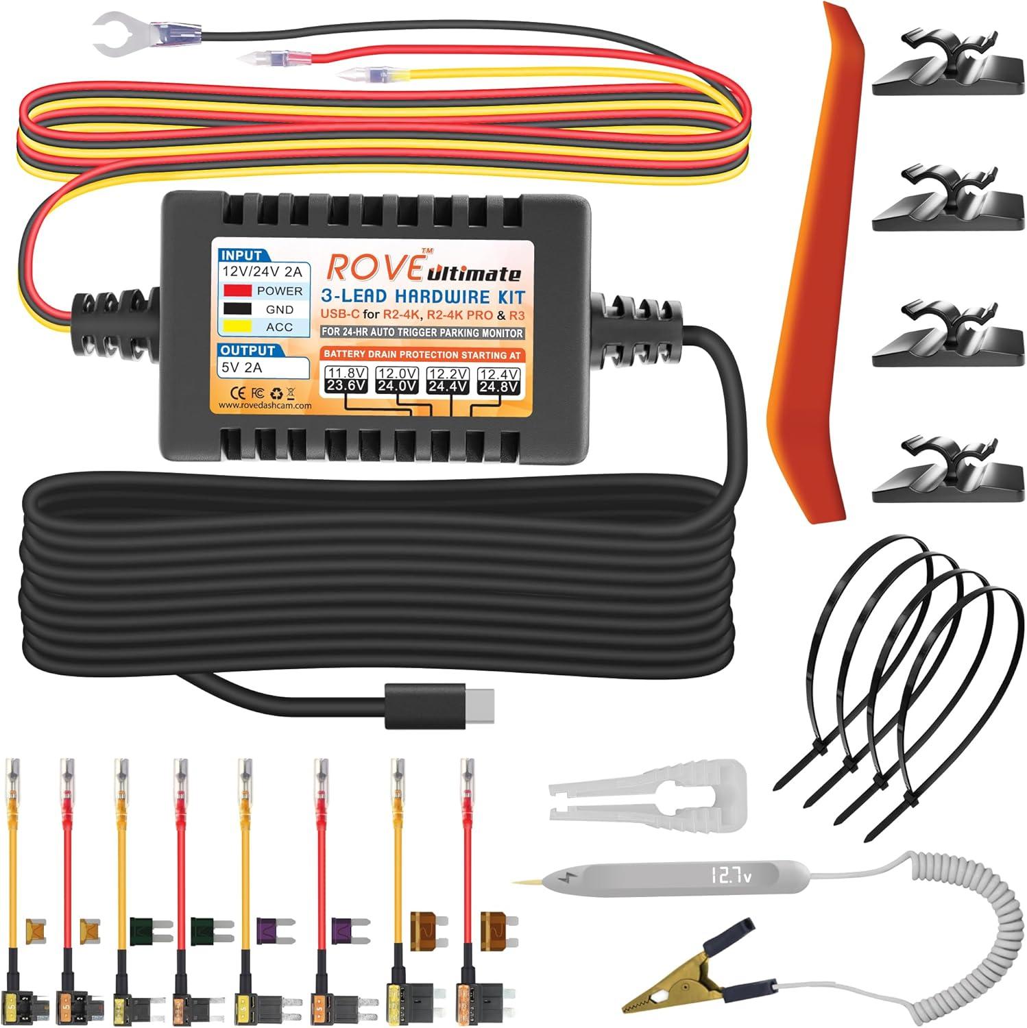 【ROVE ULTIMATE TYPE-C HARDWIRE KIT】 ROVE R2-4K PRO dash camera for cars has built-in 24-HR Auto-trigger parking mode that can go into parking mode or motion detection automatically when you use the ROVE Ultimate 3-Lead Type-C Hardwire Kit
