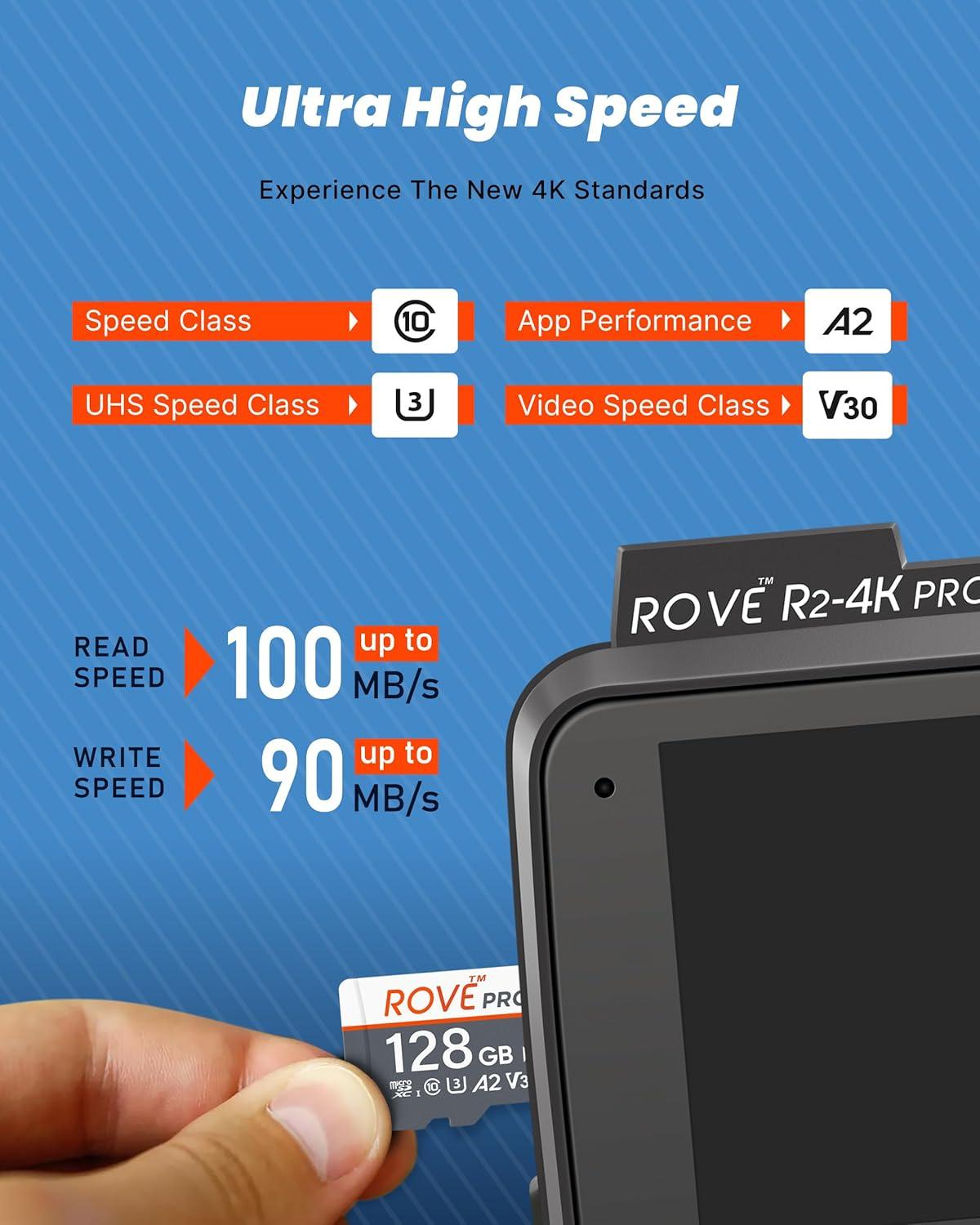 ROVE PRO 128GB MICRO SD CARD: Read/Write Speed up to 100/90 MB/s. We recommend ROVE PRO or ROVE Ultimate Micro SD Card for peace of mind, smooth and reliable operation of your dash cam.