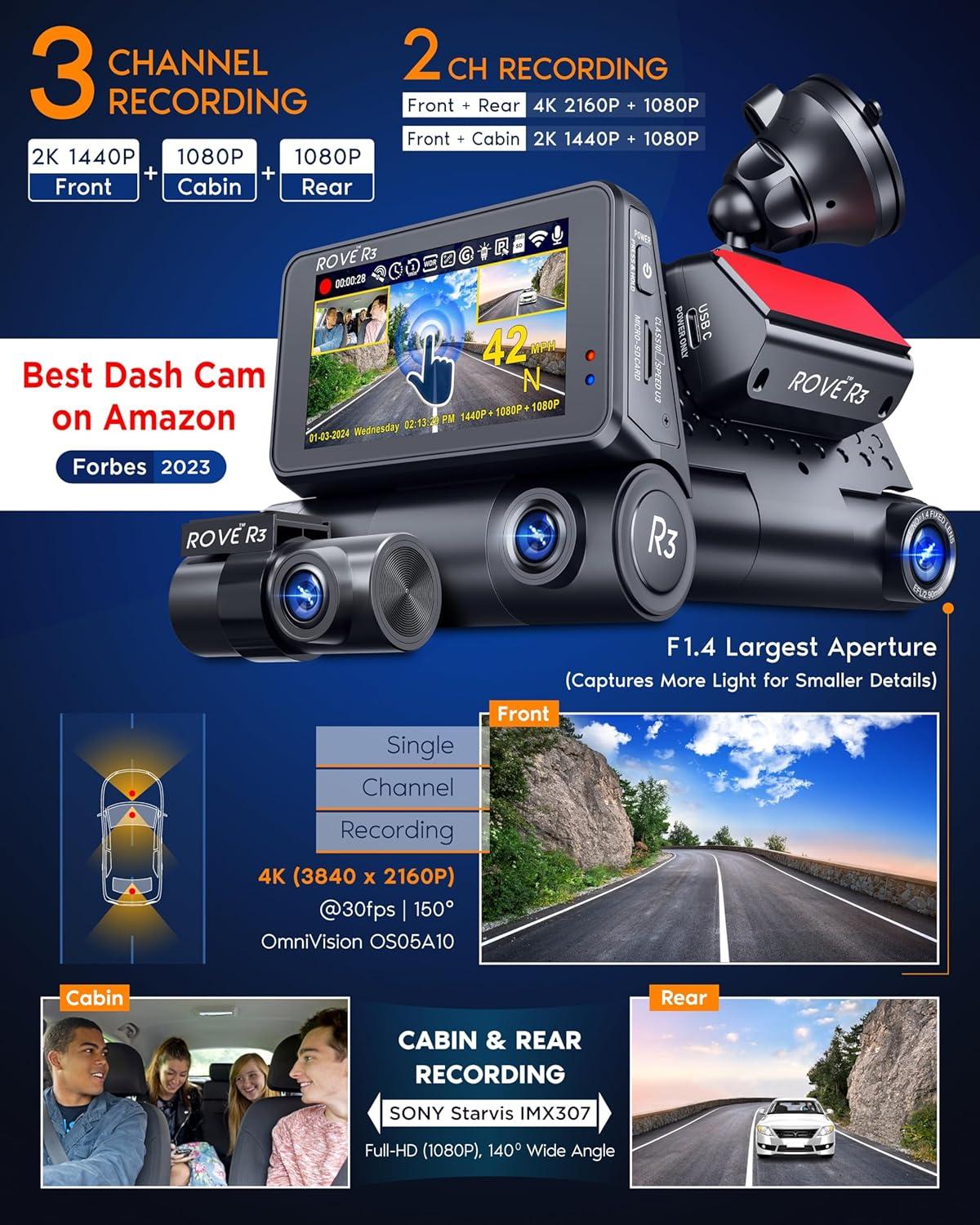 ROVE R3 DASH CAM: A powerful, compact, beautiful software and most reliable 3 Channel touch screen car dash camera.