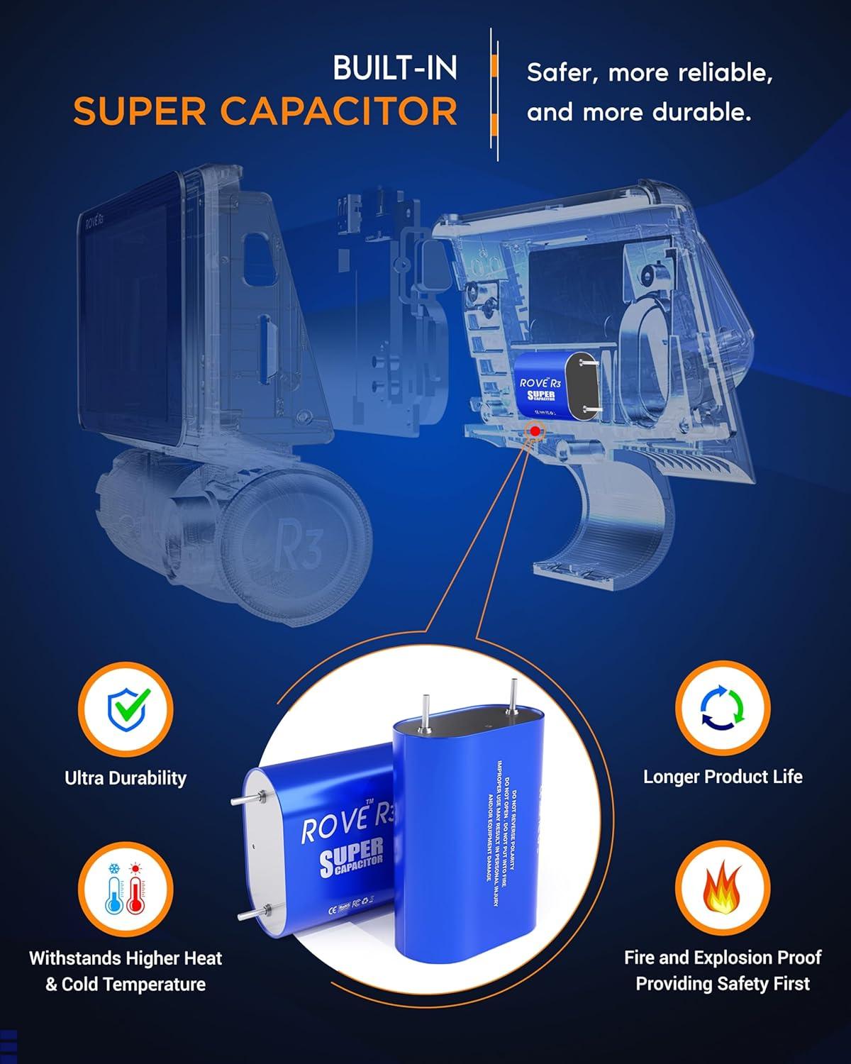 【Let's talk about all the bells and whistles】Here we go, It's got 3″” IPS touch screen, 3 channel recording front + cabin + rear, the all-new ROVE APPs for iOS and Android, remote firmware updates, always ON dual-band 5.0 GHz and 2.4 GHz built-in WiFi for super-fast transfer speed of up-to 30MB/s, Built-In Quad-Mode GPS for live speed, compass, and location stamps, proprietary fail-safe voice guidance, supercapacitor offers safety and longer product life unlike other internal battery dash cams.
