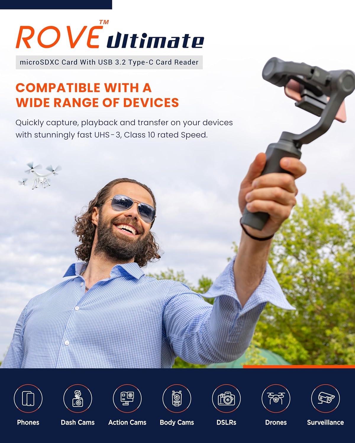 ROVE Ultimate Micro SD Card microSDXC 256GB Memory Card with USB 3.2 Type C Card Reader 170MB/s C10, U3, V30, 4K, A2 for Dash Cam, Android Smart Phones, Tablets, Games(128GB)
